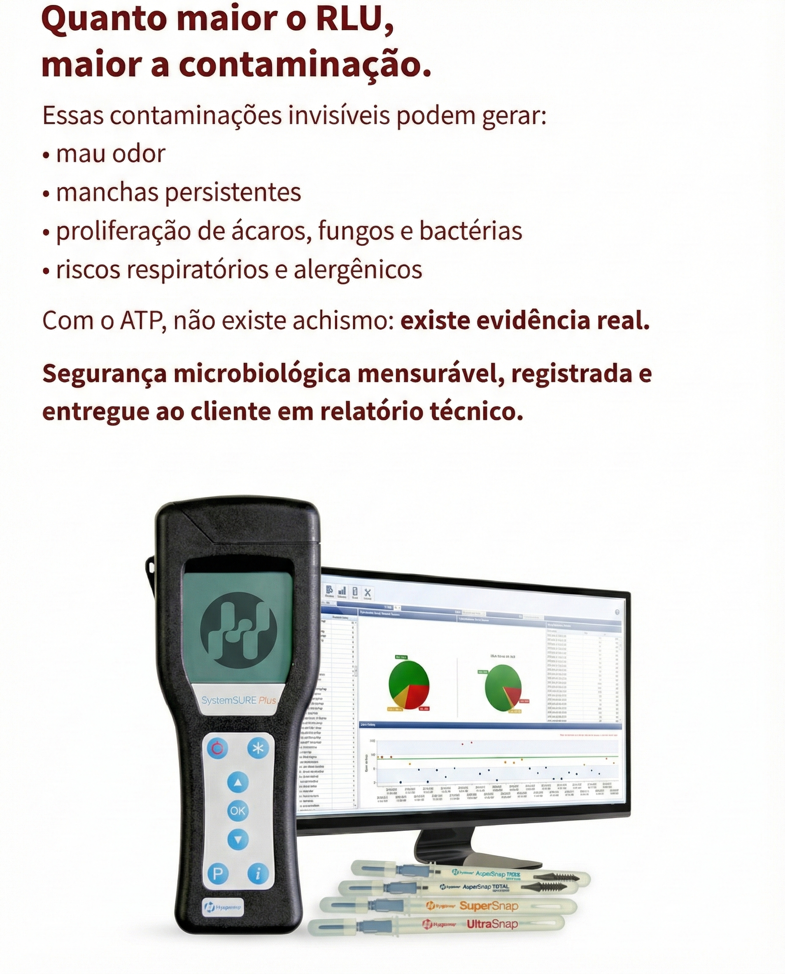 O ATP Test identifica resíduos biológicos invisíveis a olho nu. Essas contaminações invisíveis podem gerar mau odor, manchas persistentes e riscos respiratórios e alergênicos.